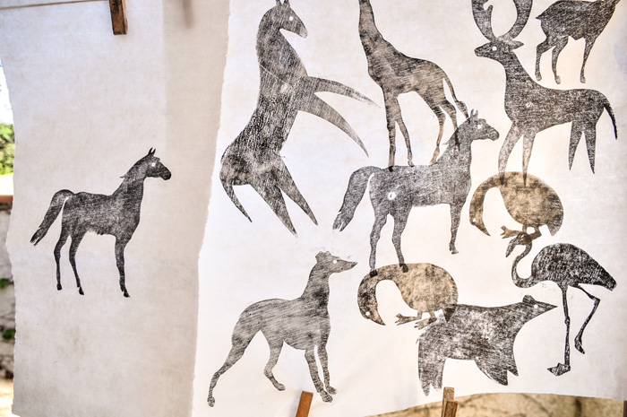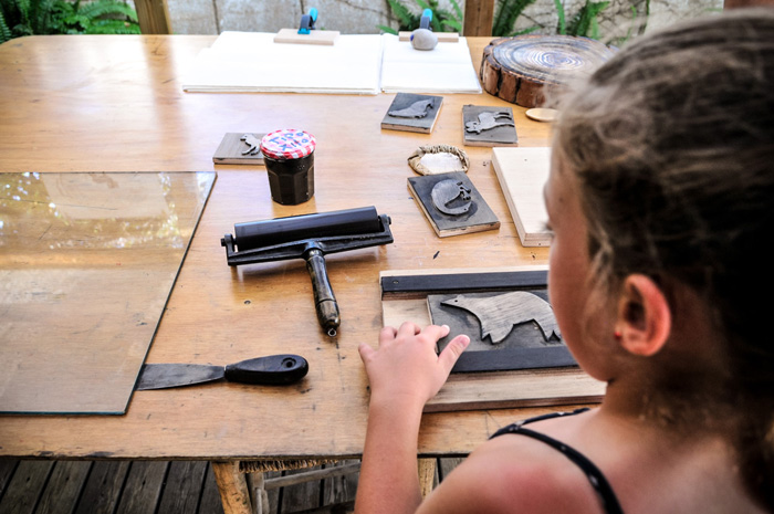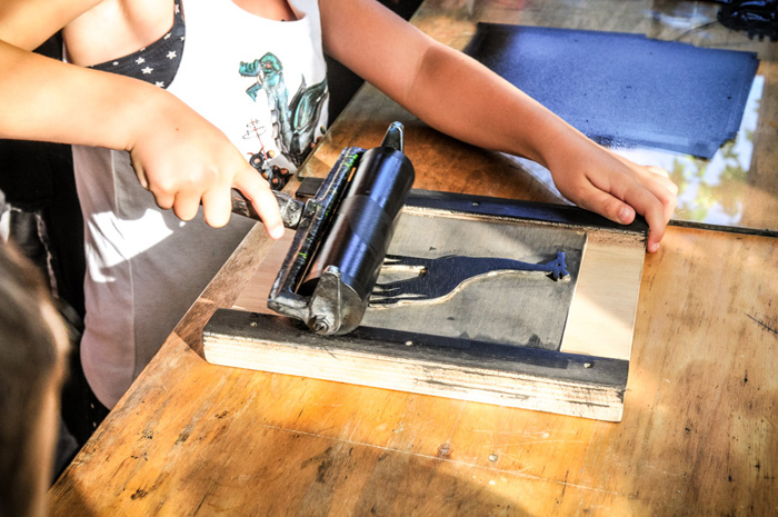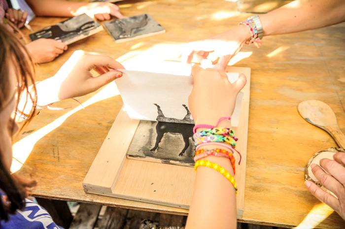 Una sesentena larga de niños y adultos tuvimos la oportunidad de experimentar cómo se estampa sobre un papel, de una manera muy parecida a como se han realizado las ilustraciones del libro. También se leyó y comentó la historia que contiene.