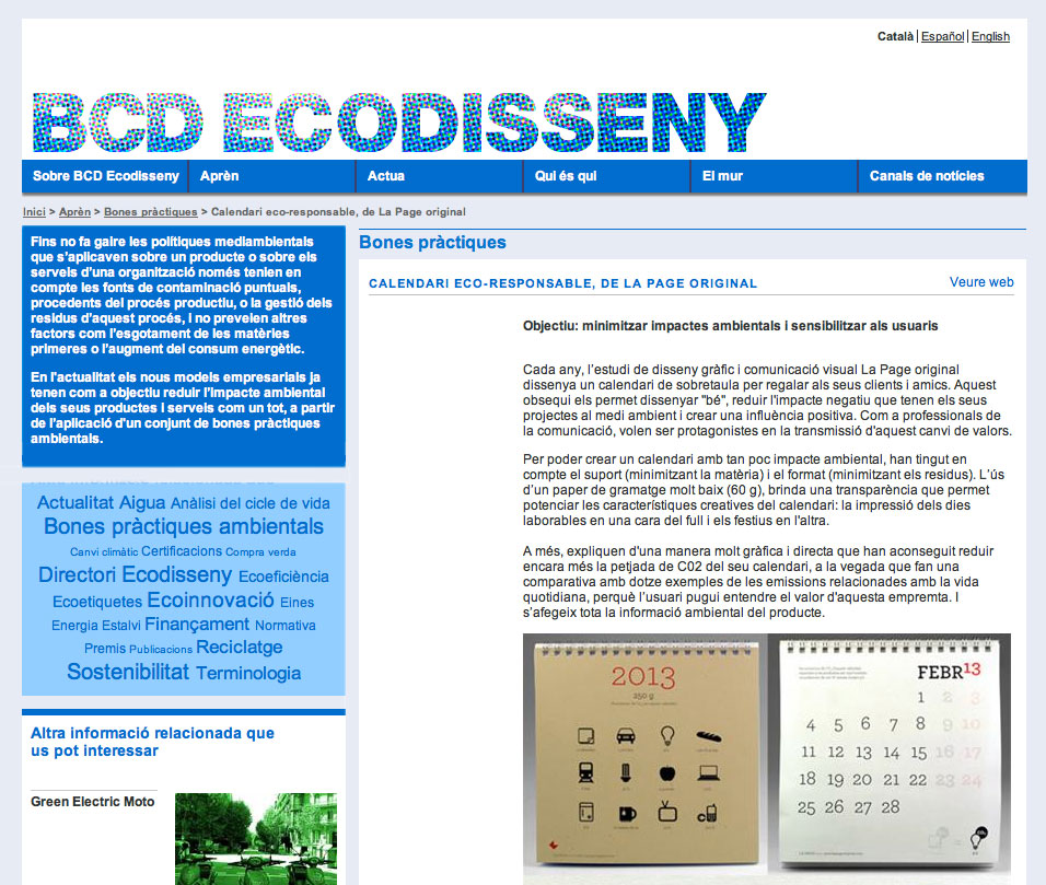 La plataforma BCD Ecodiseño da una visión amplia del factor ecoinnovación, y trata tanto el proceso de producción, como en la optimización de los recursos naturales para lograrlo. El diseño es una herramienta de competitividad. Por este motivo estamos muy contentos de que proyectos del estudio de la Page aparezcan como ejemplo de buenas prácticas en BCD Ecodiseño; reivindicamos así la importancia del sector del diseño gráfico y la comunicación.