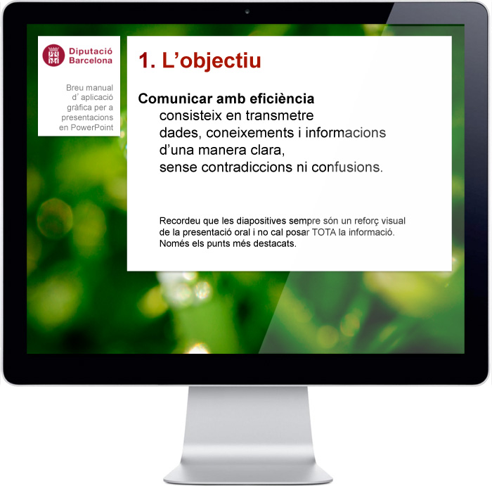 Tener una imagen sólida y actual en las presentaciones sin duda refuerza la identidad visual y la veracidad de aquí se presenta y de lo que se presenta. Tener unas pautas gráficas sencillas pero versátiles y unos consejos de cómo realizar una presentación de manera que se pueda garantizar su eficiencia, es de una gran utilidad para las personas que desarrollan los proyecto de una manera autónoma y sin la necesidad de los servicios de un diseñador para el día a día. Con esta intención se hizo este breve manual acompañado de un curso de formación para los técnicos.