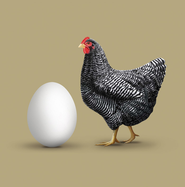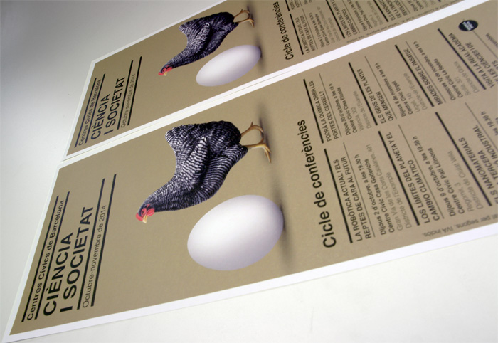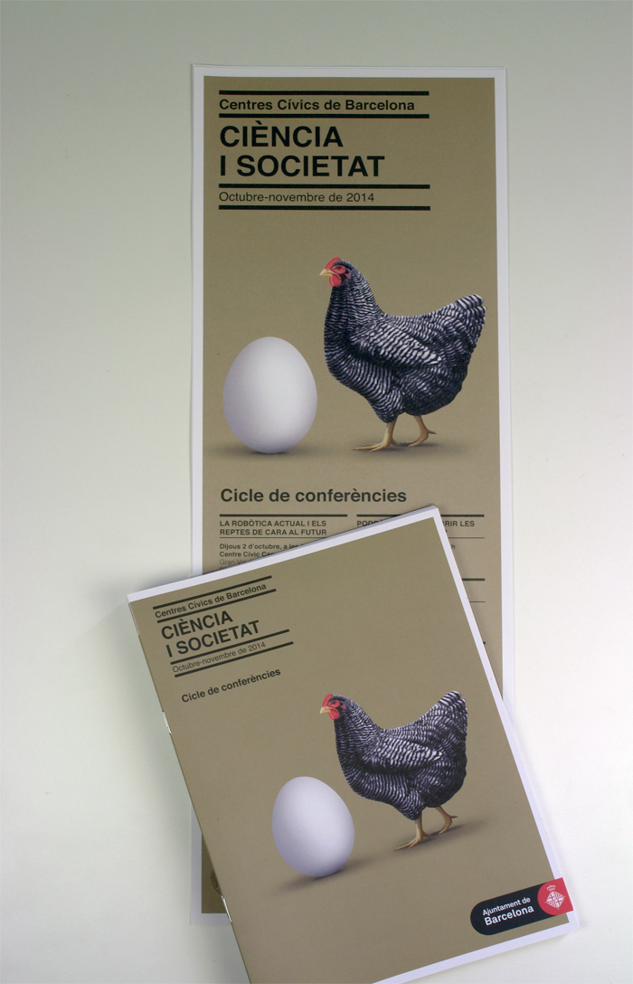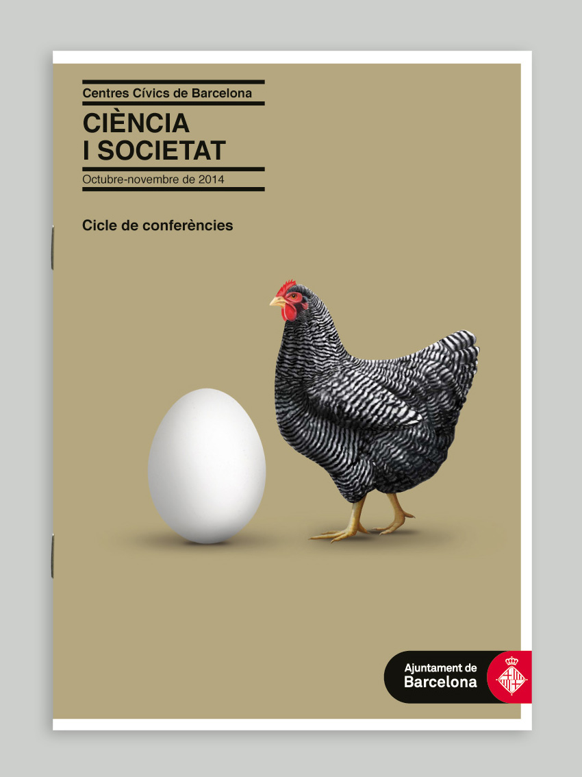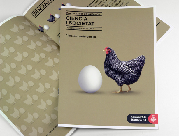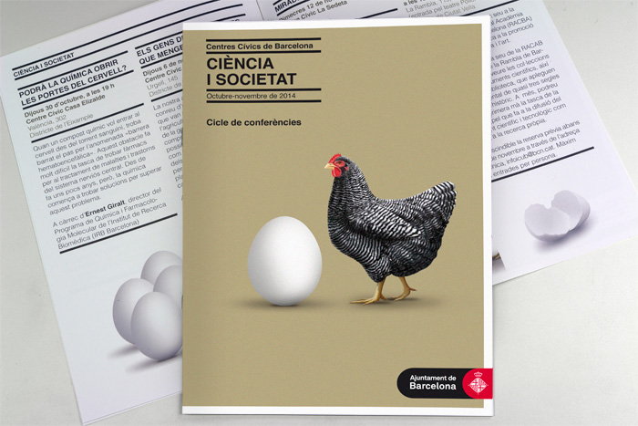 Para crear la imagen del ciclo de conferencias que proponían realizar los centros cívicos de Barcelona con el título Ciencia y Sociedad, partimos del dilema popular «que es primero el huevo o la gallina«, como punto de reflexión sobre la vida y la ciencia. La metáfora nos sirvió para acercar los temas científicos a la gente de la calle, creando una imagen divertida y cercana.