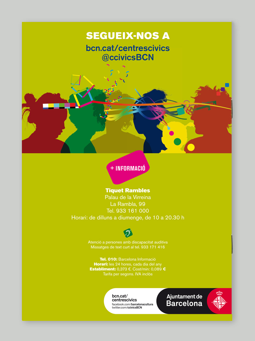 Gràfica pels centres Cívics de Barcelona per l’any 2015/2016. Havíem de representar el paper dels centres a la ciutat, una imatge de qualitat i proximitats, on la gent fossin els grans protagonistes de totes les activitats que els centres proposen. Així la figura humana és un dels elements gràfics protagonistes on es fusiona amb composicions simbòliques que ens evoquen a diferents propostes, l’art, la música, la imatge, la ciència, tallers i activitats familiars.