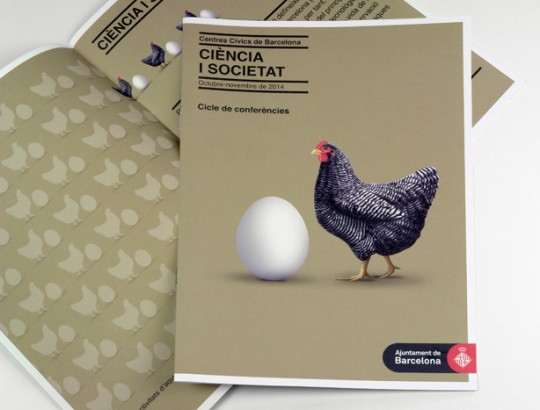 Per crear la imatge del cicle de conferències que proposaven realitzar els centres cívics de Barcelona amb el títol Ciència i Societat, vam partir del dilema popular “que és primer l’ou o la gallina”, com a punt de reflexió sobre la vida i la ciència. La metàfora ens va servir per apropar els temes científics a la gent del carrer, creant una imatge divertida i propera.