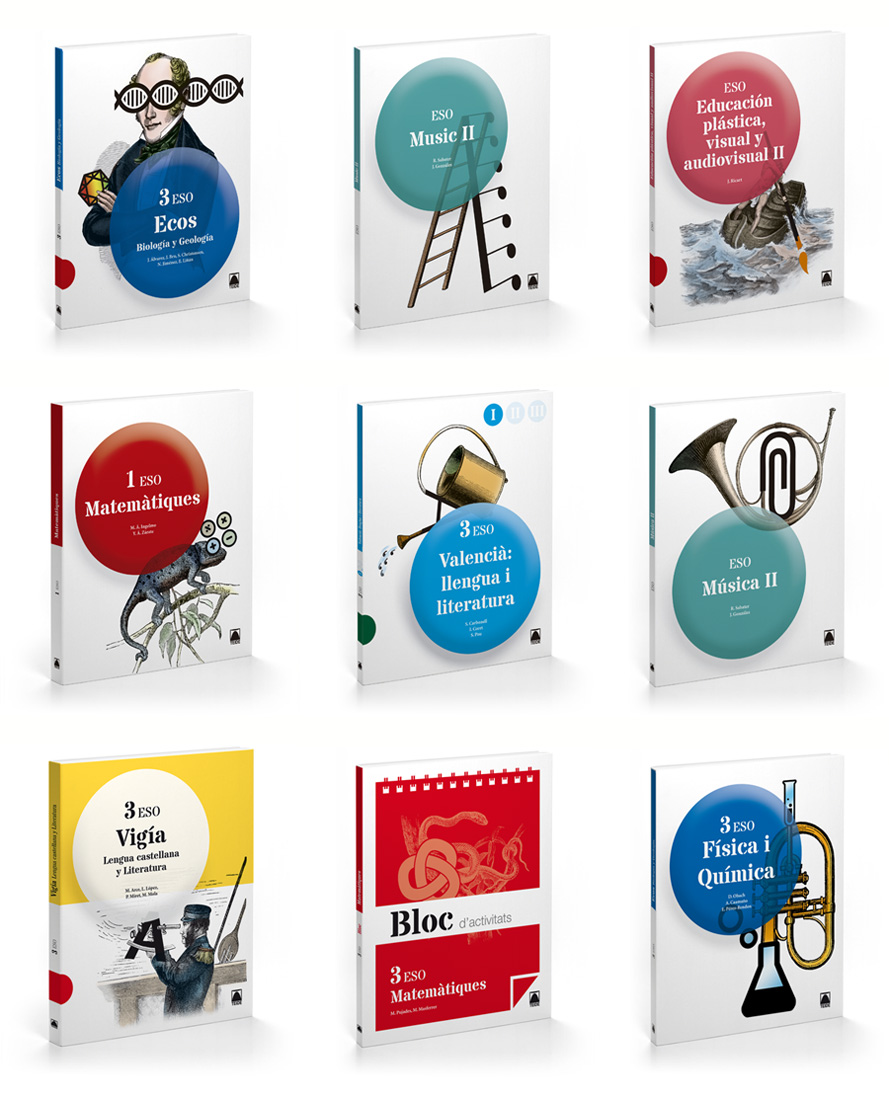 Una imatge amb un toc d’humor que ens mostra una nova i suggerent realitat. La combinació de dos llenguatges gràfics: els gravats com a font de coneixement del passat amb les icones representatives de la comunicació del present, ens donen un gran ventall de possibilitats expressives per realitzar les més de 150 cobertes pels llibres de text i quaderns d’activitats de les diferents assignatures dels cursos de l’ESO de tot l’Estat espanyol. Descobrir quines connexions hi ha entre aquests dos mons gràfics ens ha donat moltes hores d’una activitat creativa excitant. la_page_TEIDE_varis1 la_page_TEIDE_varis2